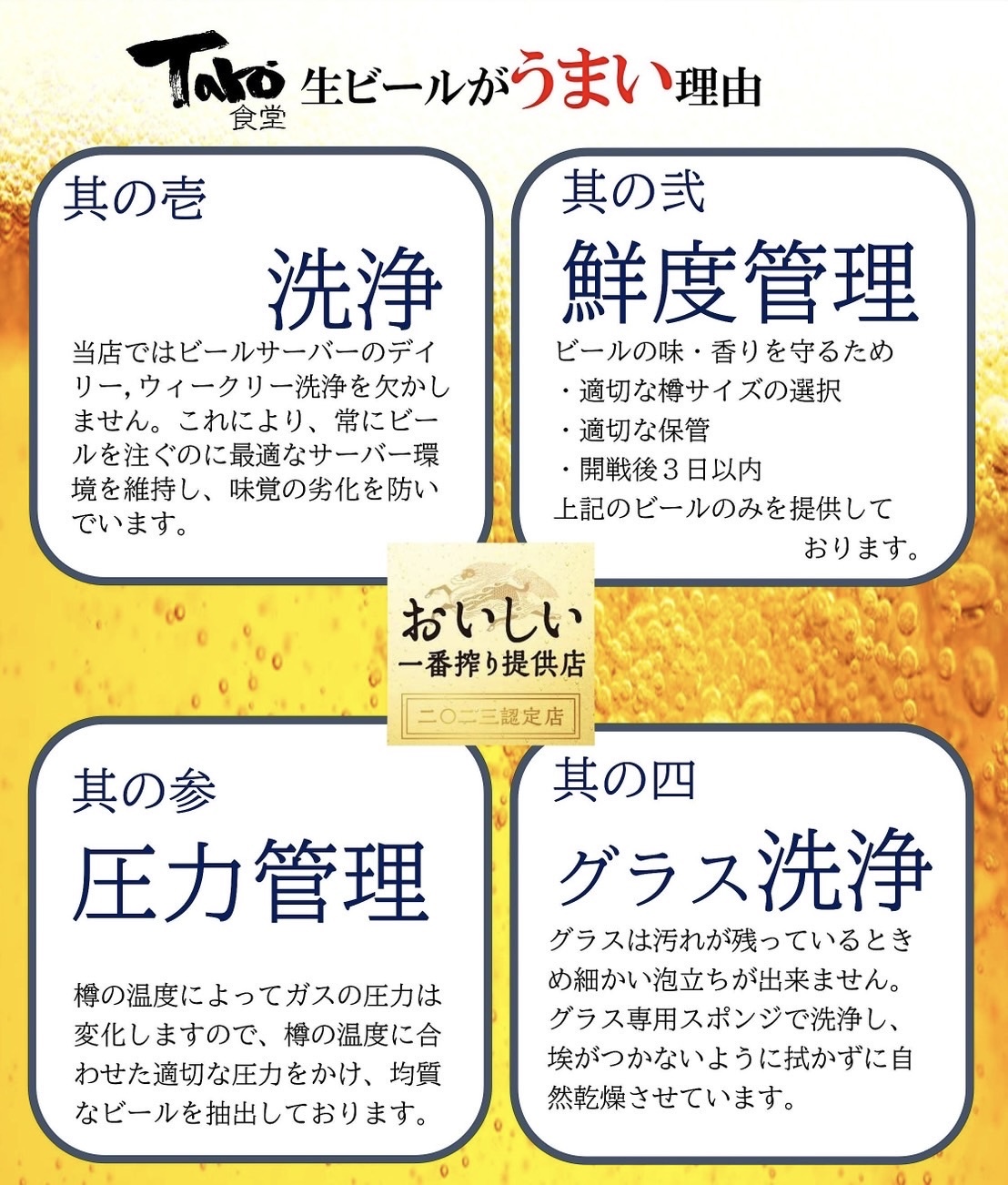 当店では、季節ごとに生ビールの種類を2種類ご用意しております 洗浄・鮮度管理・圧力管理・グラス洗浄を徹底して行い、最高のビールを提供しております